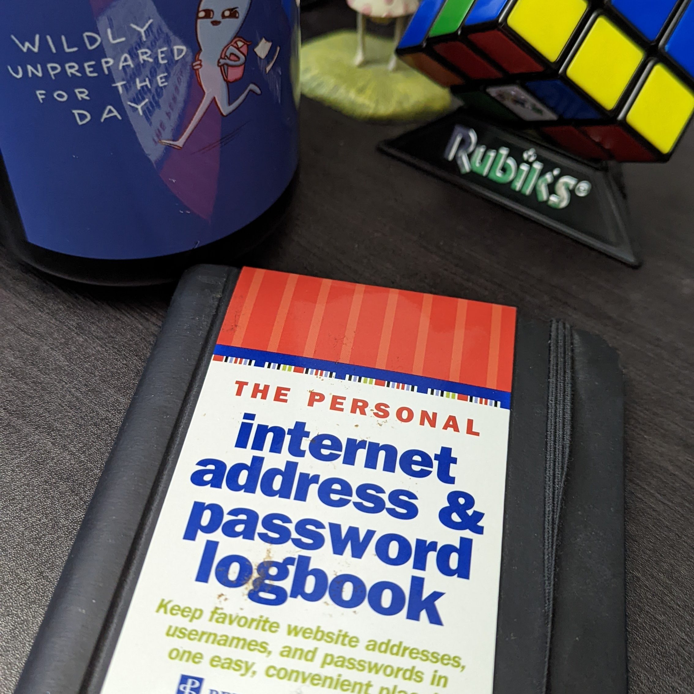 The Personal Internet Address & Password Logbook is, as its title states – a logbook for passwords and internet addresses. The final few pages logbook also allows you to record home network configurations, software license numbers, other notes. Years ago, I displayed the book on my desk at work. Working at an identity and access management company whose mission was to make individual passwords obsolete, the logbook was a soon-to-be ancient artifact for my coworkers and me to joke about. After leaving that company, it found a place on my bookcase at home and was quickly forgotten about.